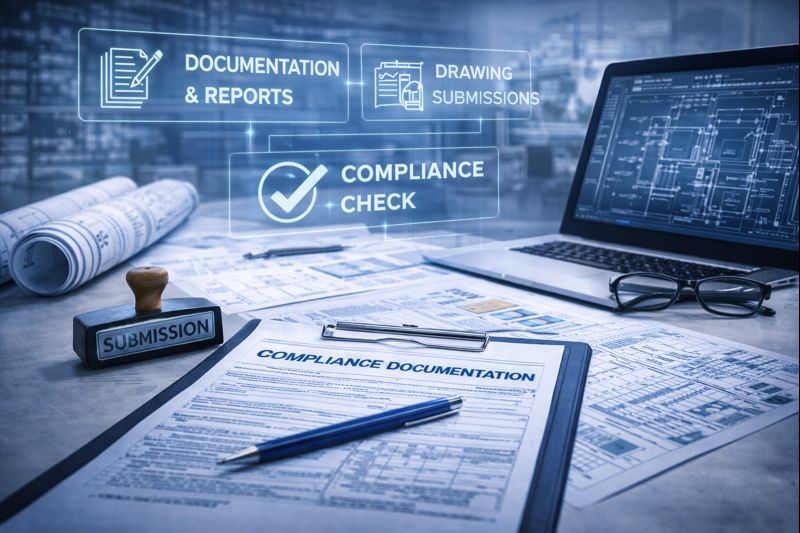 Preparation, verification, and submission of drawings, reports, and statutory documentation.