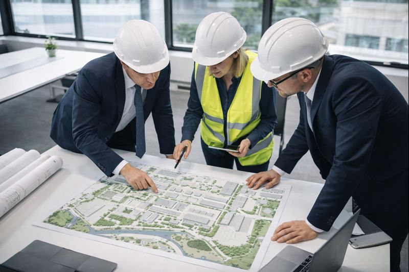 Zoning, circulation, expansion planning, and infrastructure alignment for large industrial campuses.